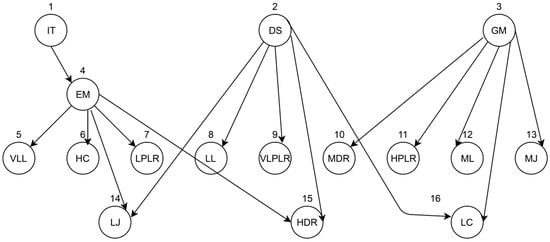 By analyzing the network model of Figure 2, there are three stages of nodes. The first-stage nodes include 1, 2, and 3, which deal with IT, DS, and GM. They have only two alternatives.