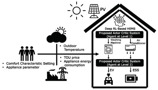 Recently, data-driven approaches based on various machine learning (ML) methods have gained popularity owing to their more efficient residential energy management. In [19,20], methods to predict the generation output of a PV system accurately during the day for efficient energy management of buildings were presented. These methods employed an artificial neural network (ANN) and a deep neural network (DNN), respectively. DNN methods were also used in [21,22,23] for load forecasting to minimize the energy usage of buildings and households. More recently, RL has received attention as a promising ML method for the energy management of buildings and homes. A pioneering study on RL-based energy management is Google DeepMind, which was developed using RL and proved to decrease the electricity bill by cooling the data center by approximately 40%. Another RL-based method, referred to as Q-learning, was applied to HEMS problems. It was integrated with the ANN module for estimating the consumer’s comfort level, maintaining the energy efficiency of household appliances [24,25] and predicting the pricing in real time [26]. A new demand response strategy for HEMS was proposed through the combination of Q-learning and fuzzy reasoning, which reduces the number of state-action pairs and fuzzy logic for reward functions [27]. Furthermore, methods based on deep reinforcement learning (DRL) such as Deep Q-Network, and policy gradient, were applied for energy management of building [28,29] based on both discrete and continuous action spaces. A holistic DRL method for the energy management of commercial buildings was presented in [30] where Heating, Ventilation, and Air conditioning (HVAC) system, lighting, blind, and window systems are controlled to achieve energy savings within the buildings’ occupants comfort in terms of thermal, air quality, and illumination conditions. To resolve the limit of model-free DRL methods such as low sample efficiency, a model-based RL method was developed for building HVAC control that trains the system dynamics using neural networks [31]. Based on the trained system dynamics, the operation of the HVAC system was managed by model predictive control to minimize both the energy cost and the indoor temperature constraints violation. The DRL approach was also applied to data centers with servers, which aim to minimize the energy used for moving air and on-demand cooling in the data centers through the control of the temperature and relative humidity of air supplied to the server [32].