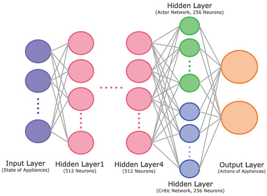 In this subsection, we illustrate the proposed DRL method based on the actor–critic method that determines the optimal policy to minimize the electricity bill within the consumer’s preferred comfort level and the appliance operation characteristics. Compared to value-based RL methods, the policy gradient approach is appropriate for engineering problems with continuous action spaces. In general, the continuous policy gradient network obtains state information from the agent and returns the appropriate action using a normal distribution. The network yields the mean and variance to achieve a normal distribution, and the agent samples the action randomly based on the resulting distribution. In the actor–critic approach, the additory method of criticizing the Q-value for its efficiency and convergence is added. Therefore, the network provides the mean, variance, and Q-values to find the optimal actions. As shown in Figure 2, the proposed actor–critic network model for each level consists of one input layer for state elements, four hidden layers for a common body network with 512 neurons, one hidden layer for each actor and critic networks with 256 neurons, and one output layer with means and variances of the operation schedules of appliances and Q-values. In this study, a hyperbolic tangent function was used as a transfer function. In addition, the adaptive moment estimation (ADAM) optimization algorithm [35] was used for training the proposed DRL model with a learning rate of 0.00004. Finally, Algorithm 3 illustrates the procedure of the actor–critic-based HEMS algorithm that learns the energy management policies, which optimize the cost of electricity and consumer’s comfort level for level 1 (WM and AC) and level 2 (ESS and EV).