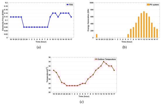 Profiles of electricity price and weather. (a) time-of-use (TOU) price; (b) photovoltaic (PV) generation; (c) outdoor temperature.