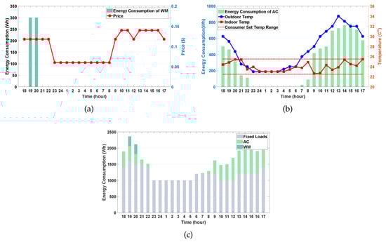 We assumed that the predicted PV generation energy in Figure 3b and predicted outdoor temperature in Figure 3c could be calculated accurately. The maximum energy consumptions of the WM and AC were set to 300 and 1000 Wh, respectively. For the ESS, the battery capacity is 4000 Wh, and the minimum (), maximum () and initial SOE () of the ESS were set to 400 Wh (10% ), 4000 Wh (100% ), and 2000 Wh (50% ), respectively. The maximum charging and discharging energy of the ESS were both 1200 Wh. For the EV, the battery capacity was 17,000 Wh, and the minimum (), maximum () and initial SOE () of the EV were set to 1700 Wh (10% ), 17,000 Wh (100% ), and 9350 Wh (55% ), respectively. The maximum charging and discharging energy of the EV were both 10,000 Wh. For the reward function, the consumer’s preferred operating period for the WM was set to [9:00 a.m., 10:00 p.m.] along with 2 h of consecutive operation time. The range of consumer’s comfortable indoor temperature controlled by the AC was set to [22.5 °C, 25.5 °C]. For the EV, the preferred SOE () and the departure time () of the EV were set to 12,750 Wh (75% ) and 8:00 a.m., respectively. The pairs of penalties for the cost of dissatisfaction of the WM, AC, ESS, and EV were {, , , , and }, respectively.