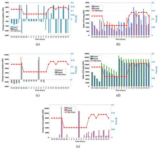 Performance comparison between Case 1 and Case 2. (a) energy consumption of the energy storage system (ESS); (b) state of energy (SOE) of the ESS; (c) energy consumption of the electric vehicle (EV); (d) SOE of the EV; (e) net consumption of household.