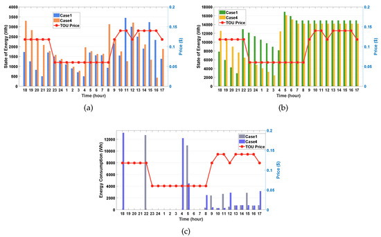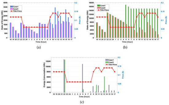 In this case study, we investigate and compare the performance between Case 1 (on a weekday) and Case 3 (on a weekend). We considered that the EV stays at home during 24 h in the weekend. Given that the EV does not depart, the consumer’s preferred SOE of the EV is not considered in the proposed algorithm. First, we can observe from Figure 6a that the SOE of the ESS in Case 3 is generally lower than that in Case1 even if the weather is sunny. We can interpret this observation as follows.
