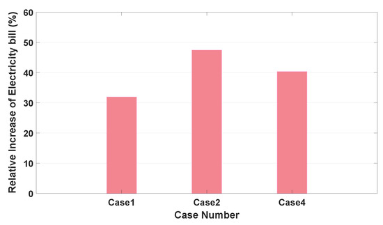 Figure 8 shows a relative increase of the total electricity bill for the aforementioned Cases 1, 2, and 4 with respect to Case 3 with the minimum total electricity bill using the following metric: