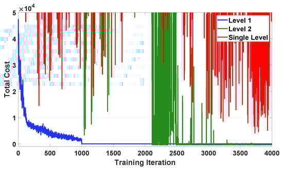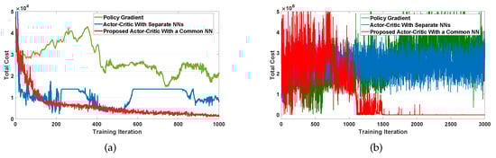 Figure 9a,b show training curves that present the convergence of the total cost for the first and second levels, respectively. Each figure compares the three training curves using policy gradient method, actor–critic method with separate actor and critic neural networks (NNs), and proposed actor–critic method with a common NN. We observe from Figure 9a,b that policy gradient and actor–critic with separate NNs show a poor performance of the convergence. By contrast, the proposed actor–critic shows that the training curves steadily decrease and then converge to an optimal policy within a moderate training period.
