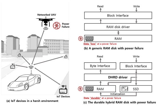 A reliable but responsive storage device is an inevitable concern for realizing sustainable Internet of things (IoT) devices for mission-critical systems [1]. Unlike general consumer devices, sustainable IoT devices must perform their own tasks correctly in a stable manner without failures. As shown in Figure 1a, mission-critical systems need to ensure rapid system recovery and resilience, even in the face of a sudden power failure because one failure inside a mission-critical system may result in a mission failure or a tragedy. Therefore, realizing sustainable IoT devices ensuring low read latency for accessing critical data, as well as data durability for storing critical data, is a critical factor for their sustainability [2]. Short boot times are also an important factor in mission-critical IoT systems because it should be ready for certain mission-critical tasks even after a sudden power failure. Regarding these points, flash-based storage is considered to be a de facto storage module for sustainable IoT platforms under a harsh environment due to its relatively fast speed and operational stability compared to disk storage. To achieve these design goals, usually flash-based Solid-state drive (SSD) is installed with the configuration of single attached or Redundant array of inexpensive disks (RAID)manner, and mostly, IoT operating systems such as Android Things [3], and an I/O subsystem in the operating system, manages the storage device [4]. Although their performance is considerably faster than disk-based mechanical storage devices, the read and write latency still could not catch up with that of Random-access memory (RAM). Therefore, RAM could be used as a storage device or system for time-critical IoT applications.
