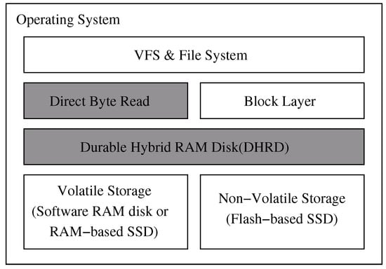 Figure 2 shows the software architecture of the DHRD to provide data durability. The DHRD consists of high-performance volatile memory and non-volatile storage. The high-performance volatile storage device can be implemented as a RAM disk (RAM disk software). The non-volatile storage device can be implemented with flash-based SSDs. Non-volatile storage devices are generally slower than volatile memory storage devices but do not lose data during power failure. In the proposed system, the volatile memory storage is used as the main storage area, and the updated data in the volatile memory also gets updated to the non-volatile storage device synchronously.