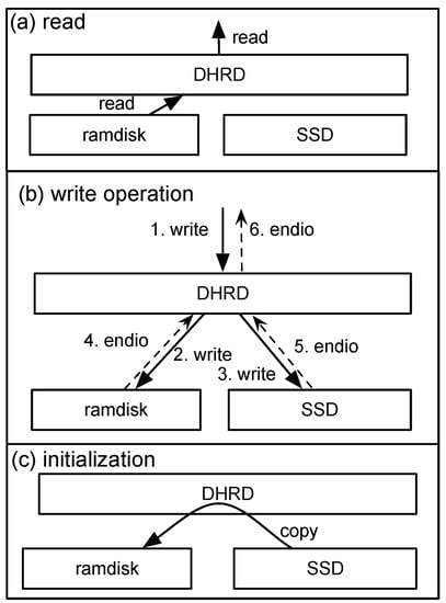 - Reads: Figure 3a shows the read operation of DHRD. The data contained in the RAM disk are always the same as those in the SSD; therefore, all read requests delivered to DHRD are forwarded only to the volatile memory. In other words, read operations are performed only in the RAM disk.