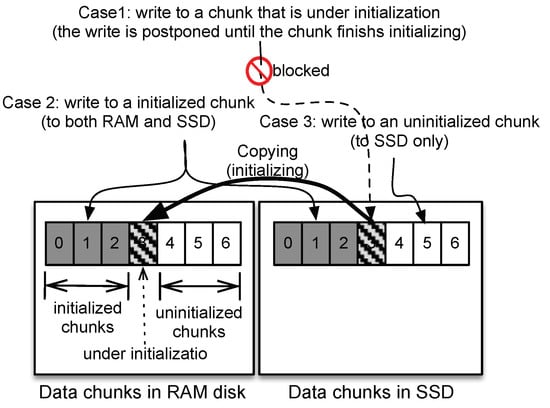 - Case 2: Write requests to initialized chunks are processed as normal writes. This means that the write requests are delivered to both the SSD and the RAM disk.
