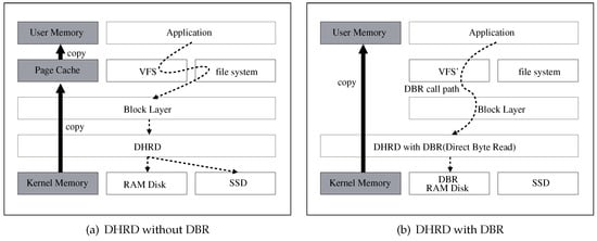 Figure 5 compares redundant memory copy with a direct byte read (DBR). The DHRD without the DBR is presented only as a block device, and performs I/O with the page cache. If the DBR is applied to the DHRD, data can be copied directly from the memory of the RAM disk to the user memory without having to go through the block layer.