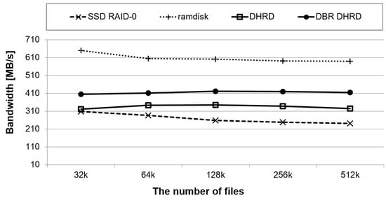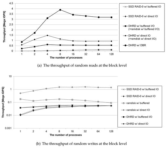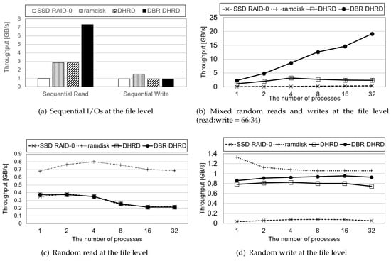 At first, Figure 6a shows the performance of random reads in the block devices without a file system. In the block-level I/O operations, the block devices could be driven by buffered I/O or direct I/O, so these were applied to the SSD RAID-0, RAMDisk, and DHRD, respectively. The DBR DHRD does not distinguish between buffered I/O and direct I/O for reads, instead always treats them as DBR. As shown in the results, the proposed DBR DHRD showed 64 times better read throughput than ‘SSD RAID-0’, which uses direct I/O. On an average, the write throughput of the DHRD with direct I/O was twice that of the DHRD that used buffered I/O. The DBR DHRD showed 2.8 times better read performance than the DHRD that used direct I/O. DBR is implemented as light weight codes, while direct I/O has more complex computing overhead than DBR that has less locks and has no page cache flush and waiting calls. The DBR DHRD, which has low computing overhead and no redundant memory copy, showed the highest read performance.