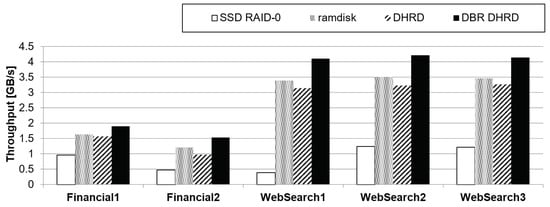 Figure 7 shows evaluation conducted Storage Performance Council (SPC) traces that consist of two I/O traces from online transaction processing (OLTP) applications running at two large financial institutions and three I/O traces from a popular web search engine [30]. We replayed the SPC traces on the DBR DHRD, DHRD, RAMDisk, and SSD RAID-0 at the block level. The DHRD showed 8% slower performance than the RAMDisk. However, DBR DHRD showed 20% better performance than the RAMDisk and 270% better performance than the SSD RAID-0. The DBR DHRD performed best on SPC workloads that had mixed reads and writes.
