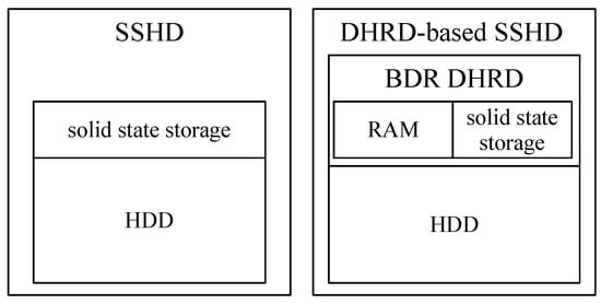 A Solid-State Hybrid Disk (SSHD) is being used on a personal computer, in which SSHD is composed of SSD and Hard disk drive (HDD) inside the storage device. In the SSHD, Several GB of SSDs significantly improve overall performance. Modern state-of-art storage systems employ tiered storage devices [26,27,28]. For the tiered storage device, the DBR DHRD scheme, proposed in this paper, can replace SSD in SSHD device. It can significantly improve I/O performance with DBR method.