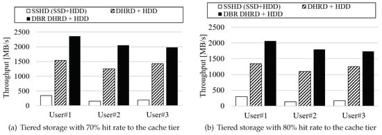 The I/O traces used in the experiment were collected from three general users using a personal computer. One is a system administrator user, two are developers, and their daily I/O traces are collected and used as experimental I/O traces. In those tiered systems, I/O traces collected from users were performed and throughput is estimated. During the experiment, it is assumed that 70% and 80% of all I/O traces are allocated to SSD or DHRD, which is considered to be the cache tier in tiered storage system.