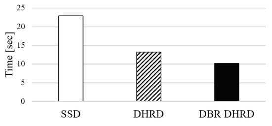 Lastly, we conducted experiments on reading and rewriting video files, which is a kind of experiment applicable to multimedia-oriented IoT applications. In this experiment, 1.8 GB sized video file is read, modified partially, and save it as another file. For each system configuration, i.e., SSD, DHRD, and DBR DHRD, we did those operations three times and measured overall execution time. The results are plotted in Figure 12. As shown in the figure, DBR DHRD and DHRD were 2.26 times faster and 1.74 times faster than SSD, respectively. From the results, we identify that DBR DHRD can be applied to IoT devices that deal with multimedia data.