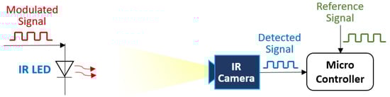 By controlling the IR LEDs’ on/off behavior in the transmitter signal, a specific pattern is encoded. Then, the waveform can be read by the IR camera and decoded by a microcontroller as a serial bitstream. A schematic of the signal modulation is presented in Figure 5 to illustrate the process.