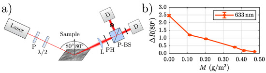 An optical method capable of detecting and distinguishing between different thicknesses of trivalent chromium conversion (TCC) coatings on rough cold-rolled AA3003 aluminium substrates has already been presented in the literature by us showing that our suggested measurand correlates strongly with the estimated coating weight M [19]. This finding is briefly reviewed in Figure 1. The left panel of Figure 1 schematically depicts the sensor concept: The light beam of a helium-neon laser (, ) is guided grazingly (angle of incidence amounts to with respect to the surface normal) onto the sample. The polarizer (P) only transmits linearly polarized light and the /2 waveplate rotates the polarization direction to . The specularly reflected light is focused with a lens (L, ) and guided through a pinhole (PH). Using a polarizing beam splitter (P-BS), the light beam is separated into two perpendicularly polarized parts and detected by two Si-photodiodes (D, OSD50). It is important that the detection takes place in specular direction, meaning . Figure 1b shows the result of a measurement performed with the setup depicted in Figure 1a. Six cold-rolled AA3003 samples with different coating weights M have been investigated. Our measurand decreases strongly with increasing coating weight.