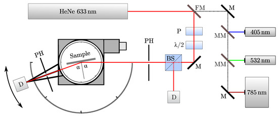 The experimental setup for the optical measurements is schematically sketched in Figure 2. For investigating the angular dependency of our measurand , we used two independent rotating motors (Newport Corporation, Irvine, CA, USA, model M-URM80CC) as goniometer. Thus, we can precisely control the angle of incidence and detect the specularly scattered light with . By means of magnetic mirrors (MM) and a flip mirror (FM), it is possible to couple four different lasers into the setup and thus investigate the wavelength dependency of . We used 405 (Picotronic GmbH, Koblenz, Germany, model DD405), 532 (Picotronic GmbH, Koblenz, Germany, model DD532), 633 (helium-neon laser, ) and a temperature stabilized laser diode (Thorlabs Inc., Newton, USA, model L785P090) emitting 785 . In the main beam path, the light from one of the lasers is guided through a combination of polarizer (P) and /2 waveplate to set the polarization state to s- or p-polarization. A beam splitter (BS) reflects a certain amount of light to a reference diode (D) and thus enables us to compensate laser fluctuations. The light reflected from the sample is detected by a second photodiode after passing through two pinholes (PH), one in front and one behind the investigated specimen. It should be mentioned that the sensor concept depicted in Figure 1a operates with optimal parameters regarding wavelength and angle of incidence for investigating the AA3003 samples, as will be shown in the progress of this manuscript.