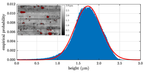Figure 3 shows the height distribution of the reference sample generated from the LSCM image presented in the inset. The examined area has a size of 212 × 282 while the red masked pickling pits covering 3.5% of the total area are excluded from the calculation of . Grooves running parallel to the long side of the specimen are clearly visible and are a result of the rolling process. Note that the height distribution is sufficient to a Gaussian distribution as shown by the fitted red line except of a slight skewness. This result holds in general for cold-rolled specimens [21].