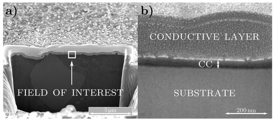 For gathering information about the coating thickness and its uniformity, we used SEM measurements after preparing a small section with a focused ion beam. The left part of Figure 4 shows a macroscopic view on the prepared section of specimen PT5 with highest coating weight. A white rectangle indicates the part that is investigated in Figure 4b with higher resolution. The conversion coating follows quite precisely the underlying substrates height variations and exhibits only small deviations in its thickness. The latter one is estimated to be smaller than 70 . Note that we provide SEM measurements of the other samples within Supplementary Material.