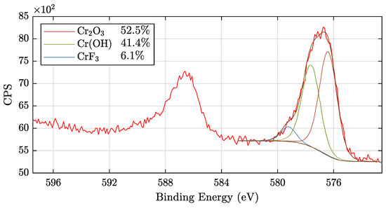 Figure 5 shows a high resolution XPS spectrum and the result of the fitting procedure of the peak for the sample PT4 as an example. The chromium species include CrO ( ), Cr(OH) ( ) and CrF ( ) accounting for 52.5%, 41.4%, and 6.1% of the total chromium, respectively. Chromium fluoride has been used for the fitting procedure because of the high amount of fluorine inside the conversion layer as suggested in reference [9]. We note that we can not completely exclude the (residual) presence of Cr(VI) species. In any case, the details of the chemical content do not enter the analysis of the optical signals, as will be shown below. Furthermore, we provide high resolution XPS spectra of the other samples within Supplementary Material.
