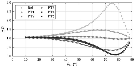 This section deals with the dependency of our measurand on the angle of incidence and the wavelength using the setup described in Figure 2. The results obtained for 633 are shown in Figure 6. While all samples head for the same value of at the periphery ( and ), they differ most strongly between and which results in all specimens being clearly distinguishable. It is noticeable that the thicker coatings PT4 and PT5 strive towards a pronounced minimum at approximately , while the other samples reach interim values corresponding to their increasing layer thickness.