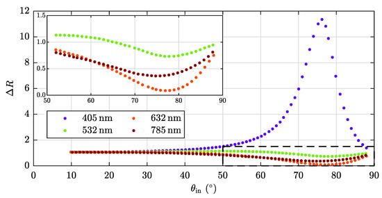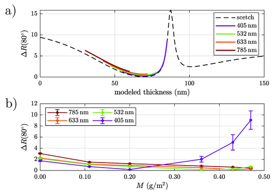 Figure 10a depicts the theoretical behavior of our measurand in black as a function of a modeled layer thickness using a wavelength of 633 . The change in phase occurring due to a different wavelength used has been converted into a corresponding layer thickness equivalent for 633 . For example, a 50 layer measured at a wavelength of 405 is converted to a modeled thickness of 78 in Figure 10. First, is a decreasing function and reaches its minimum at a layer thickness of approximately 70 . This effect occurs due to a strong decrease of the signal in s-polarization. At 87 strives to a pronounced maximum because of a strong decrease of the detected p-polarized light. The colored schemes indicate the expected result for at the corresponding wavelengths for the specific coating weight of our specimen: For 785 and 633 is a monotonically decreasing function while this is not valid for 532 and 405 .