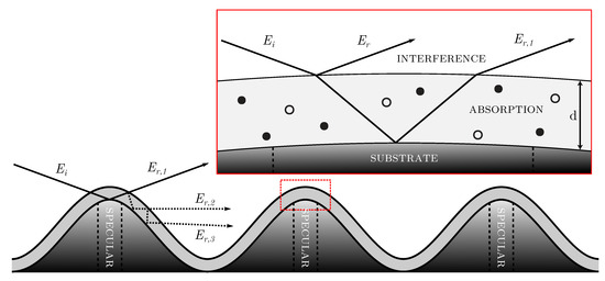 In particular, Figure 8 shows that for grazing incidence the incoming light described by the electric field interacts primarily with the mountains of the height profile. In the red marked inset we focus into a peak of such a mountain and depict the physical description for the coated specimen: One part of is reflected at the air–coating interface, the other part transmits into the layer obeying Snell’s law. The latter is reflected at the coating–substrate interface, propagating again through the TCC layer. Reaching the coating–air interface, the beam again is split into two parts, one transmitting into air (denoted as ) and the other one staying in the coating due to reflection. Note that the rays and , which are reflected several times within the conversion layer, experience an additional change in direction. As a result, they do not contribute to the specularly reflected part and thus are not considered in the mathematical description of the coated samples. This fact is different to the model used in reflectometry and ellipsometry where multiple reflections are considered in a way that smooth specimens are required for the validity of this description. Note that for simplicity the surface is drawn as a sinusodial function and thus does not exhibit Gaussian distributed height values.