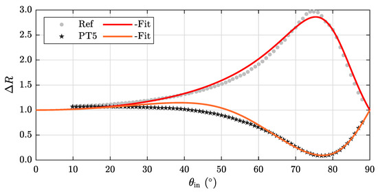 Experimental data sets for specimen Ref and PT5 together with a corresponding fit function described in Equations (1) and (5), respectively. We exclude data points ranging to for the fitting procedure due to the fact that the mentioned equations are valid only for high angles of incidence.