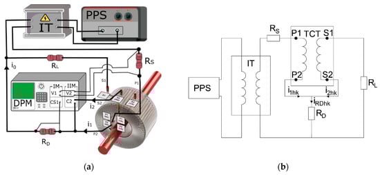 In Figure 2a,b, the following notations are used: PPS—programmable power source, IT—insulation transformer, TCT—tested CT, RD—10 Ω current shunt for measurement of differential current, DPM—digital power meter, RL—load of tested CT, RS—0.1\1 Ω current shunt for measurement of primary current 5\1 A.