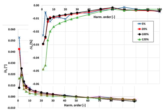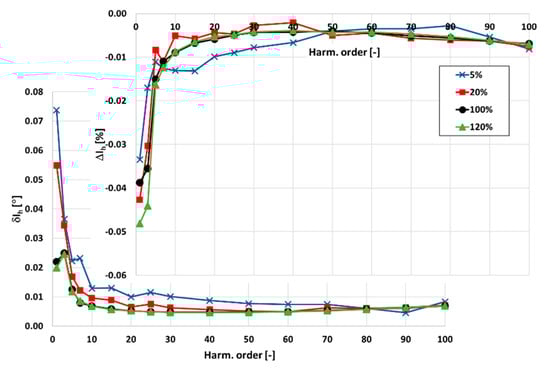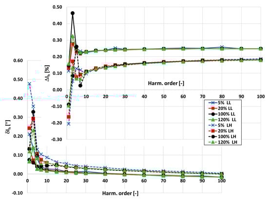 In Figure 7, values of the current and phase errors of the transformation of harmonics of the distorted primary current in the range of frequencies from 50 Hz to 5 kHz by the 300\5 A inductive CT are presented. The measurements were made for 25% and 100% of the rated load of the secondary windings when the distorted primary current was equal to 5%, 20%, 100%, and 120% of its rated rms value.
