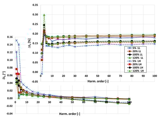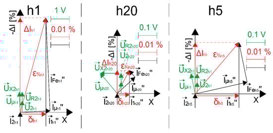 The vector ″μhk is determined geometrically as perpendicular to the vector μhk, and its length results from perpendicular vector ″Fehk that ends in a point resulting from determined values of current and phase errors of the transformation of the hk harmonic. Presented in Figure 5, vectorial diagrams allow us to draw the conclusion that both current and phase errors decrease with frequency due to the fact that the values of current associated with the active power losses in the core and magnetization current of the core decrease with their frequency. Determined values of the parameters of the equivalent circuit from Figure 1b for the 1st, 5th, and 20th harmonics are presented in Table 2.