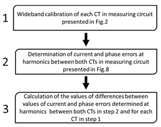 In step 1, both inductive window-type CTs are self-calibrated in the measuring circuit presented in Figure 2 in conditions of the ampere-turns obtained by application of additional primary winding. In the next step of the procedure, one of these CTs is used as a reference of primary current for the second CT. The current and phase error of the transformation of higher harmonics of distorted current by this CT are again determined in the measuring circuit presented in Figure 8. In the last step from Equations (10) and (11), the differences are calculated between values of the current and phase errors at harmonics determined in step 2 and during the previous calibration of each CT in step 1.