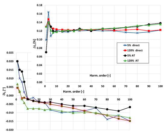 In brackets, the following additional labels are used: AT_ A\AT_B—the values of current and phase errors at harmonics obtained during calibration of each CT in step 1, D—the values of current and phase errors at harmonics measured between both CTs in step 2 of the procedure in Figure 8.