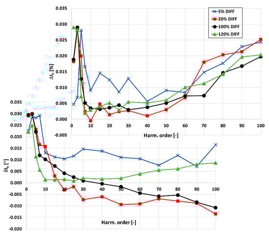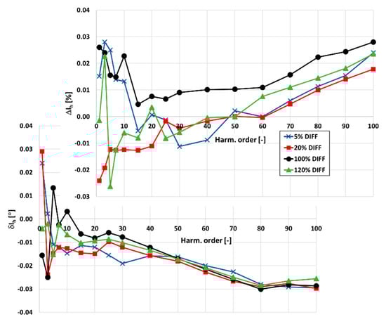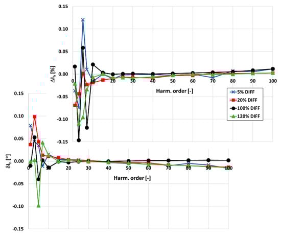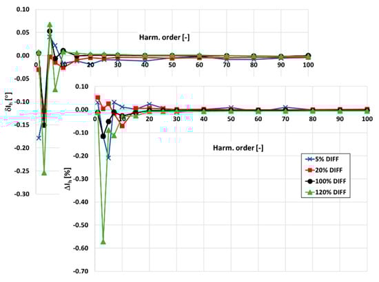 Calculated from Equations (10) and (11), differences in the values of current and phase errors at the harmonics measured between CTs 300\1 A and for each CT in the condition of ampere-turns are presented in Figure 11.