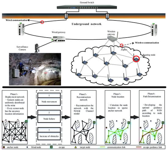 Based on these assumptions, a node localization and path guidance method is proposed, which mainly includes four phases, as shown in Figure 1. The underground mine is composed of a large number of tunnel-like structures, and these structures are intertwined. It is a typical 3D network scene, which is characterized by complex terrain, narrow space, and the emergency treatment mechanism for accidents and disasters that must be considered. An emergency rescue communication system is deployed in such a scenario. The requirements for the communication system are that high bandwidth is not necessary, the network has a strong resilience and robust reconfiguration (self-organization) capabilities, and both communication capabilities and environmental awareness capabilities are essential. Therefore, it is appropriate to construct an emergency rescue system for underground mines based on wireless sensor networks.