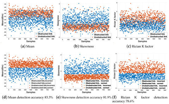 In this paper, a link obstacle detection algorithm based on hypothesis testing classifier (HTC) is adopted and compared with the support vector machine method. First, feature extraction is performed on the RSS samples. The extracted features include the mean, the skewness, and the Rician K Factor. Figure 2 is the result of analyzing the typical features of the sample set using the HTC algorithm. Figure 2a–c is the raw feature data without analysis. Figure 2d–f is the result of processing the feature data using the HTC algorithm. As can be seen from Figure 2d–f, an independent analysis of the three characteristics of the mean, the skewness, and the Rician K Factor can obtain , , and accuracy of obstacle detection. By fusing the three features, the accuracy of detecting obstacles can reach .