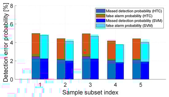 Missed detection probability, false alarm probability, and overall detection error probability of the HTC and SVM, showing the impact of different Sample subsets.