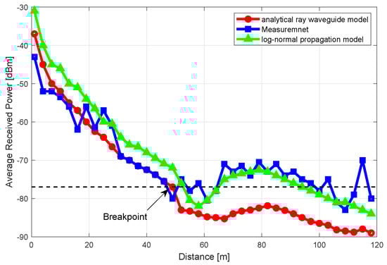 where, is the received power of the destination node at location . are the space coordinates of the destination node. is the transmitting power of the source node. is the gain of transmitting antenna and is the gain of received antenna. is the mode intensity. is the electromagnetic (EM) field distribution. is field at the transmitting antenna. is the attenuation coefficient and is the phase shift coefficient. The detail calculations of above parameters can be referred to [30]. However, Equation (1) is difficult to compute when there is an accumulative item. Thus, In a practical scenario, it is more common to use the analytical ray waveguide model to calculate the propagation losses in the underground tunnel [31]: