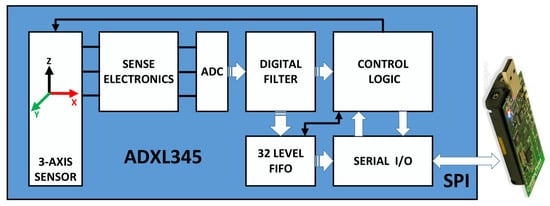 As shown in Figure 6, the ADXL345 is a 3-axis accelerometer with 13bit resolution measurement at up to g. The ADXL345 is connected to the microprocessor of the sensor node via the SPI bus. The microprocessor receives data through the SPI bus and obtains three acceleration information in the vertical direction, which is used to calculate the sum magnitude vector (SMV) [34], as shown in Equation (12).