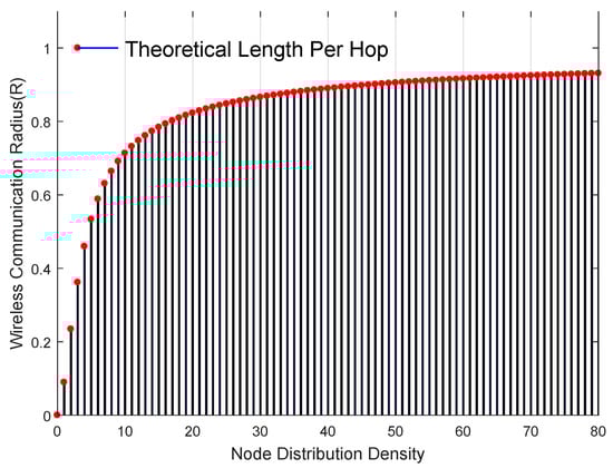 According to (13), when the density of neighbor nodes increases, the average distance per hop also increases. It can be assumed that the node density when the wireless network is deployed because the node density is the optimal value to ensure the network connectivity [28]. When the density of nodes is too high, the limit value of is communication radius R. Thus the maximum distance per hop is R. Figure 8 illustrates the relationship between the theoretical average distance per hop and the wireless communication radius under different node distribution density.