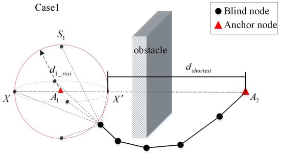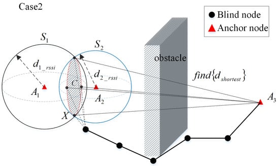 When there is just one trustable anchor in the neighbor set of the blind node, the shortest possible distance between the blind node and the possible anchor is determined, as shown in Figure 9. is the trustable neighboring anchor of the blind node X, and the distance between the trustable anchor and the blind node X, can be obtained by using the RSSI. Then, it can be assumed that the blind node X is located on the spherical face with the anchor node as the center and as the radius.