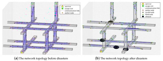The key parameters of the simulation are shown in Table 2. Before the disaster, as shown in Figure 12a, all sensor nodes know their accurate position information and each node can be taken as the anchor. But after the disaster, as shown in Figure 12b, there appear many obstacles in the scenario which can affect wireless communication. Many nodes have been changed in their location and need to be relocated, and these nodes are called blind nodes. Some nodes have failed because they receive an impact, resulting in complete failure, and these nodes are called invalid nodes. The above effects make the network reorganize, and the network topology is also reconstructed.