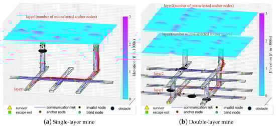 Figure 13a,b are the simulation results of a single-layer and double-layer underground mine network, respectively. The lower part of the figure is the visualization of the network scene, and the upper part is the fitting surface of the number of misselected trustable anchor nodes. The simulation results show that the smoother the surface in the graph, the better the performance of the proposed anchor selection algorithm. From Figure 13, it can be observed that the correctness of the trustable anchor node selection of the proposed algorithm is related to the node distribution density. In areas with high node density, the correct rate of trustable anchor node selection is also high. There may be selection errors in areas where the node distribution density is low, especially in the network edge area.