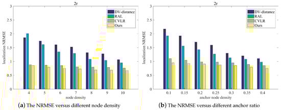 To show the scalability of the proposed method, Figure 14a illustrates the NRMSE of the compared methods for different node density under the same anchor node ratio, and Figure 14b illustrates NRMSE comparison for methods under the different ratio of anchor nodes. From Figure 14a, it can be seen that with the increase of the node density, NRMSEs of other methods exhibit the same decrease trend, especially for the DV-distance and the RAL algorithm. While for the proposed method, there is not a decreasing trend because its iterations will increase with the number of blind nodes, and the localization accuracy cannot be improved. Nevertheless, the NRMSE of the proposed method is always the lowest compared to other methods.