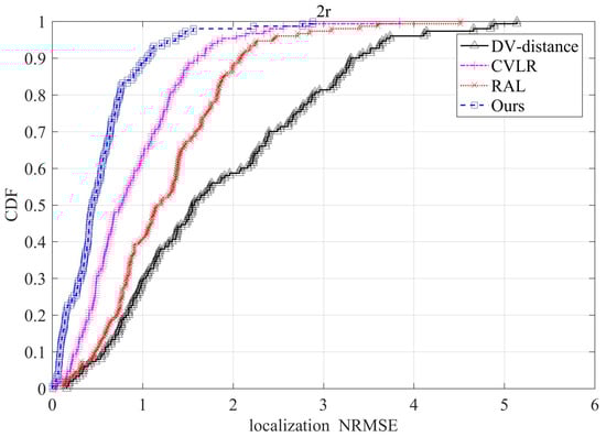 To further present the performance of these methods, Figure 15 illustrates the Cumulative Distribution Function (CDF) of NRMSE for the compared methods under the conditions that node density is 6, and the ratio of anchor nodes is 0.2. From the figure, it can be seen that by using the proposed method, almost 70% sensor nodes can achieve the localization error less than half of the transmission range R. While for CVLR, there are just 50% that can reach the localization accuracy. As for RAL and DV-distance, the two methods have lower localization accuracy. The results validate our proposed method with more details.
