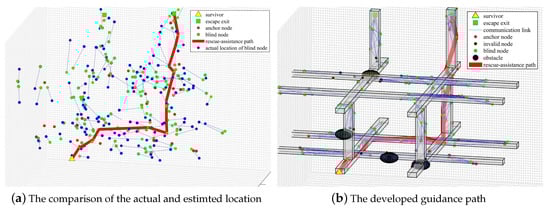 Localization results and guidance paths of the method: (a) is the comparison of the actual and estimted location of the blind nodes; (b) is the visual result of the escape path search implemented by the algorithm proposed in this paper.
