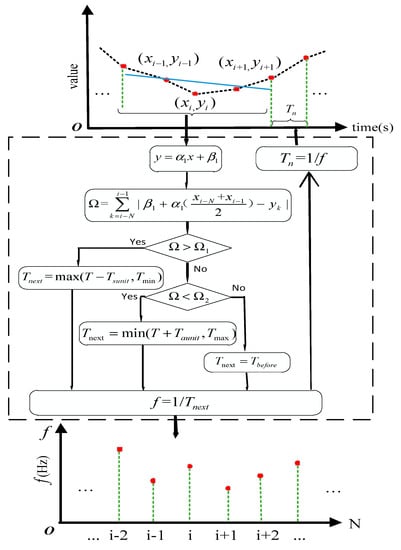 This section adjusts the sampling frequency based on the adaptive sampling strategy [27]. Firstly, it calculates the linear median jitter sum based on the straight line fitted by the linear regression. is used to represent the time of the next sampling point. ,,… represents the sampling time of the first N sampling points. ,,… represents the corresponding sampling value. represents the straight line fitted by N sampling points. The jitter of the sampling point is represented by the difference from the sampling point to the Y-axis of the median value of the line. The sum of the jitter size of N sampling points relative to the median value of the fitting line is called the linear median jitter sum