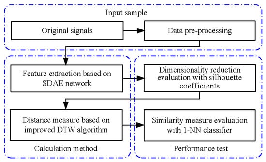 As shown in Figure 1, the proposed method and performance test constituted the processing flow for the similarity measurement of one-dimensional time-series signals. The method in the left part of Figure 1 contained dimensionality reduction of the original sequence through feature extraction based on the SDAE network and distance measurement for the extracted feature sequences of equal length through the improved DTW algorithm. The silhouette coefficients and one nearest neighbor (1-NN) classifier in the right part of Figure 1 were used to evaluate the performances of feature extraction and distance measure, respectively.