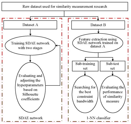 For the general time series involving the similarity measure, the need for dataset partitioning and the purpose of each divided dataset are shown in Figure 2, which primarily included two parts, namely, the unsupervised learning through the SDAE network and the supervised learning through the 1-NN classifier. Since the cost of collecting and processing the distributed high-dimensional vibration responses is often expensive or even prohibitive, two datasets with data labels (CinCECGTorso and SemgHandMovementCh2 []) were selected from the UCR time series archives to help explain the implementation process. The two selected datasets have moderate sample sizes and relatively long sequence lengths, ensuring the operation feasibility of dimensionality reduction based on the SDAE network under acceptable computing overhead. Moreover, both the selected datasets and the vibration of interest face some negatives in common, such as redundant information and outliers, which should be overcome when measuring the similarity of sequences, although their appearance and type are varied. The default training set and test set ratio of each dataset in UCR databases are different. For each of the selected raw datasets used for the subsequent research, we first merged the training and test sets, then shuffled the samples, and finally set a uniform split ratio to form datasets A and B. Table 1 shows the final processing results, in which the ratio of datasets A to B was three. Note that other partitioning ratios were also acceptable as long as the dataset to be partitioned had a sufficient sample size to ensure corresponding algorithm training. The Python packages Tensorflow and Keras, as well as their libraries [], were utilized to establish the SDAE network and calculate different distance metrics, in which the operation of the 1-NN classifier that can choose different distance measurement methods referred to in the work by Regan [].